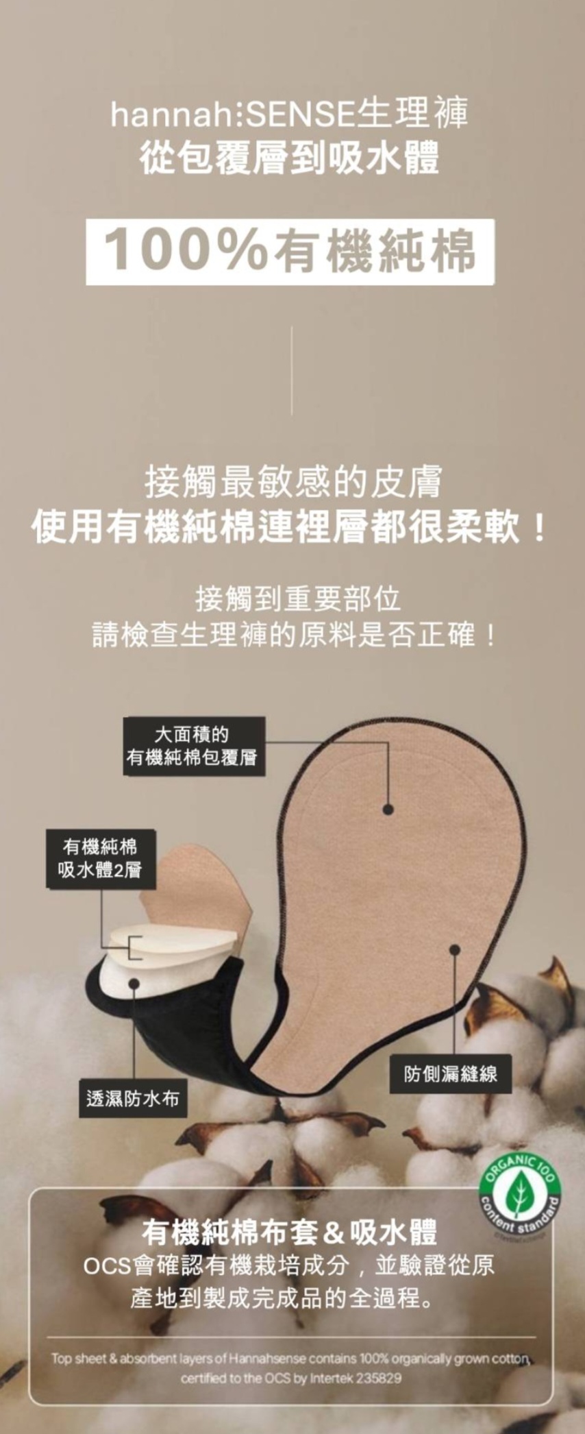 穿著棉質衛生棉和 hannah:SENSE生理褲